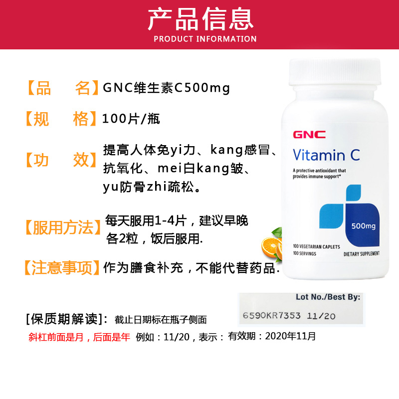 美国GNC维生素C 500MG 100粒