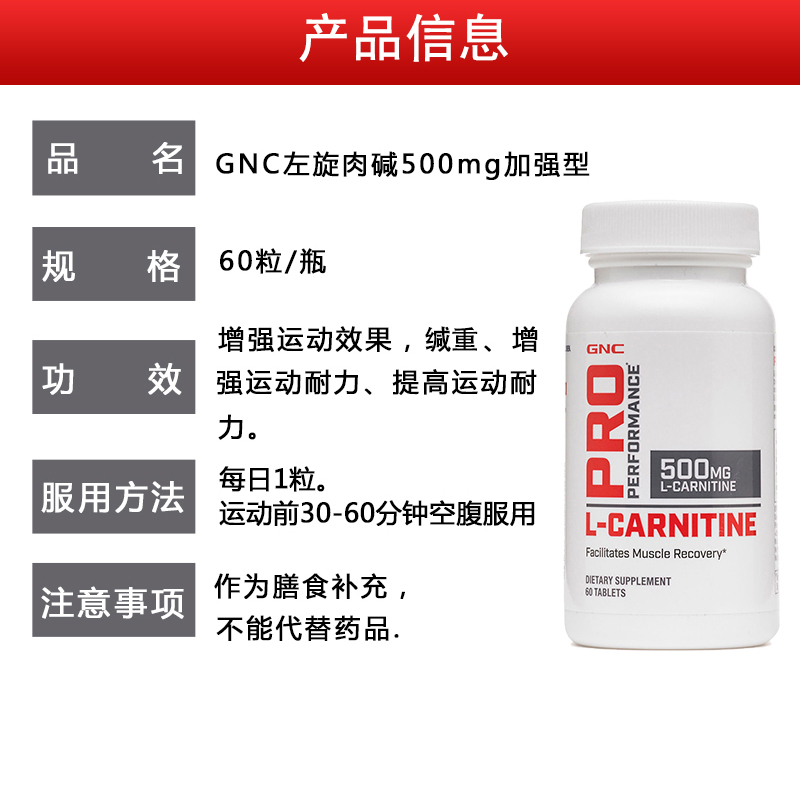 美国GNC L-CARNITINE運動形左旋肉鹼 500MG 60粒