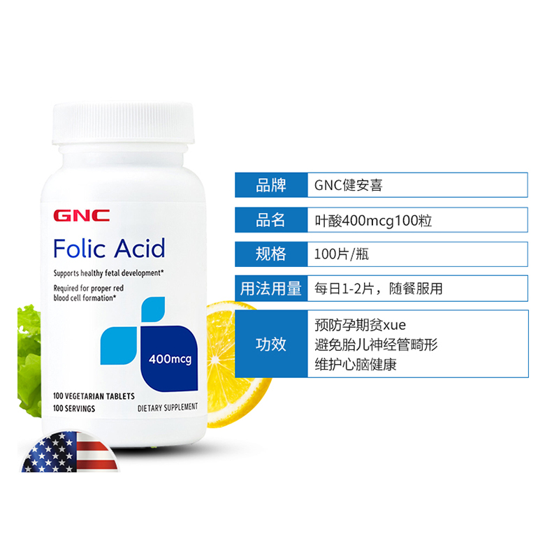 美国GNC葉酸片400mcg100粒